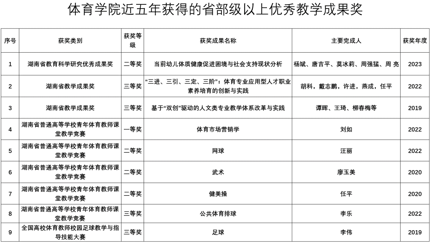 近五年,指导员工参与省级以上比赛,获得国家级一、二、三等奖5项,省级一等奖166项,省级二等奖200项,省级三等奖68项。其中2021年全国体育教育专业员工基本功大赛获得团体总分二等奖、运动技能类团体二等奖、基础理论知识与教学技能类团体三等奖,专业基础理论综合第六名,田径和跳绳两个单项第一名的优异成绩;2023年全省第七届体育教育专业员工基本功大赛中获得了团体总分三等奖、运动技能竞赛团体一等奖,单项:篮球第一名、体操和田径第三名的优异成绩;培养国家一级运动员9名,立项国家级老员工创新创业项目7项,2024年在第十七届国际先进机器人及仿真技术大赛中荣获体育与运动仿真组二等奖,全国老员工体育产业创新创业大赛“网球教学手杖”等作品荣获一、二、三等奖3项。近5年毕业生就业率均稳定在96%以上。员工考上中央民族大学、湖南大学、北京体育大学,上海体育大学、首都beats365、华南师范大学、湖南师范大学等高校硕士研究生130人,其中,2019届毕业生钟春丽、邱艳萍,2020届毕业生余芬和2021届毕业生文希理均考取了上海体育大学和华中师范大学博士研究生。