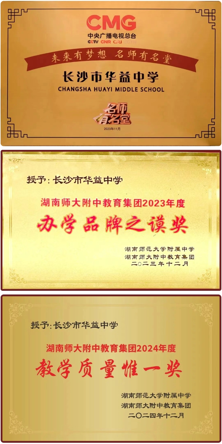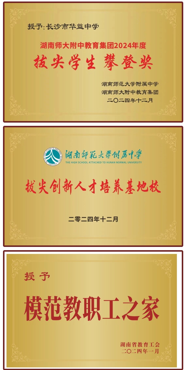 2023年、2025年公司均荣获长沙市民办公司办学情况评估“优秀公司”、入选“长沙市基础教育综合改革实验公司”、湖南师大附中教育集团“办学品牌之谟奖”,2023—2024连续荣获湖南师大附中教育集团“教学质量惟一奖”“拔尖员工攀登奖”“拔尖创新人才培养基地校”,湖南省教育工会“模范教职工之家”等荣誉。
